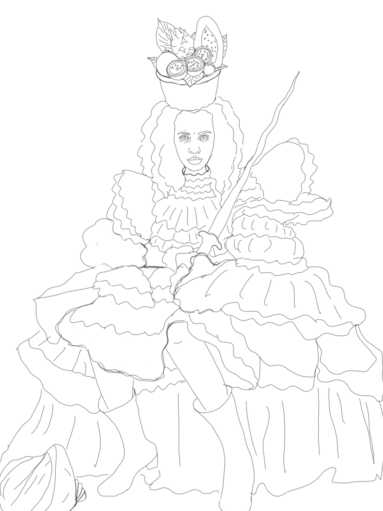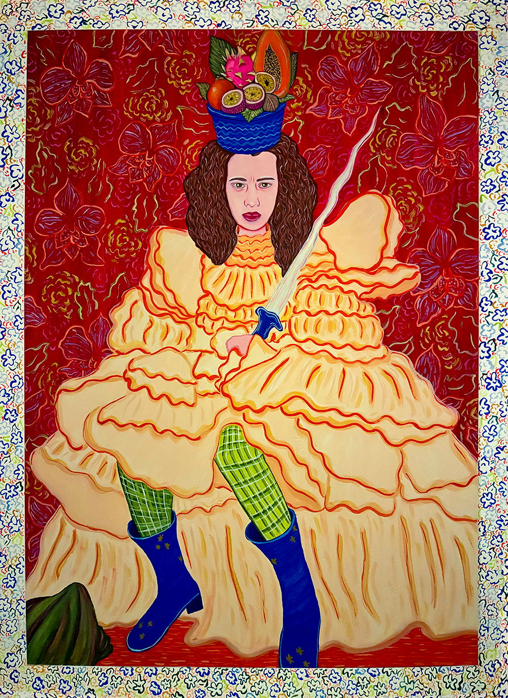 Born out of my love for puffy ruffled dresses and colorful tights I wanted to play with a mix of a masculine and feminine figure. I’ve always thought being feminine was a powerful trait but the world doesn’t always reward femininity. I wanted to be perceived as strong but my love for color and patterns seems to indicate I’m too delicate to hold my own. This portraits is a way to remind myself that even with my choice of dress and love for all things color and floral, I have always been able to stand up for myself and push forward without a masculine figure supporting me.